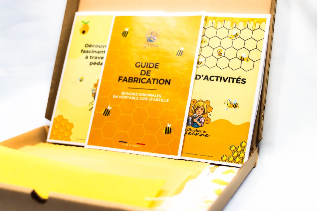 Ce Kit est composé de véritables feuilles de cire, de mèche à bougie en coton, d’autocollants d’abeilles, d’une guide de fabrication vous vous accompagner dans vos créations, d’un livret pédagogique pour découvrir le monde fascinant des abeilles, d’un livret d’activités.